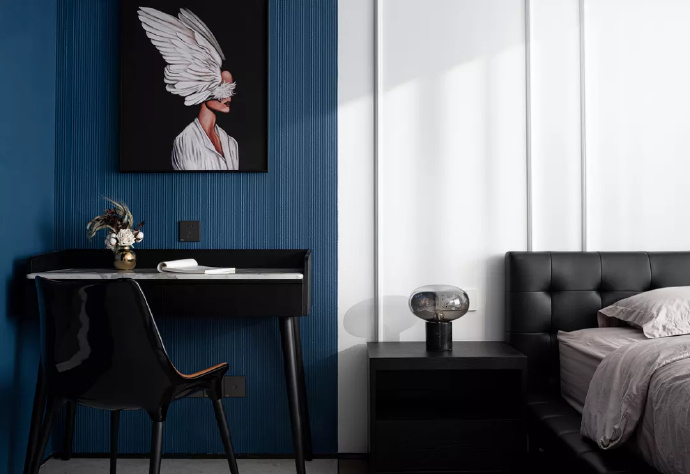 深藍色勾畫出男主人的閱讀區,海基布以其細密的紋理提升著空間質感。